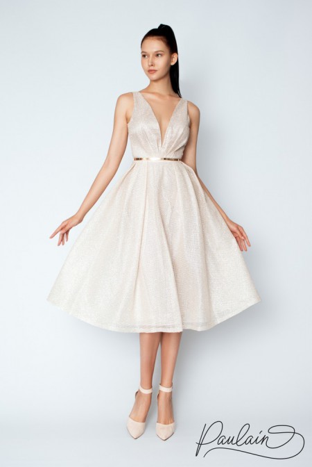 Добавить в избранноеЗапись на примеркуСияющее платье с глубоким вырезом прекрасно сидит на фигуре. Металлический пояс на платье можно приобрести отдельно. Цена указана на платье без пояса